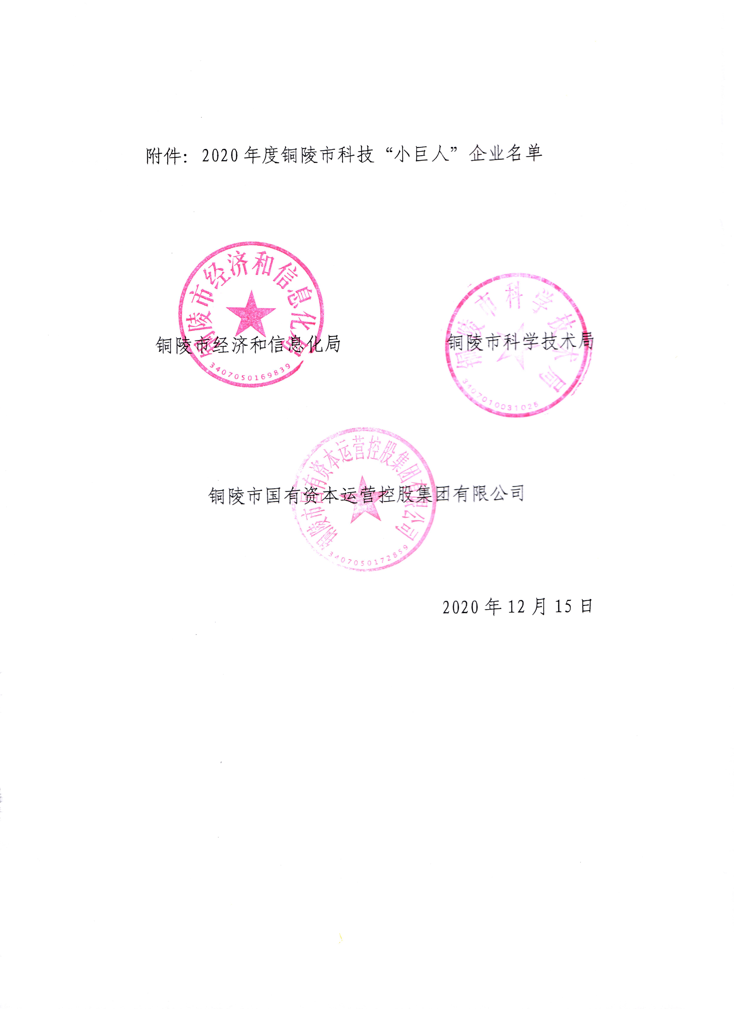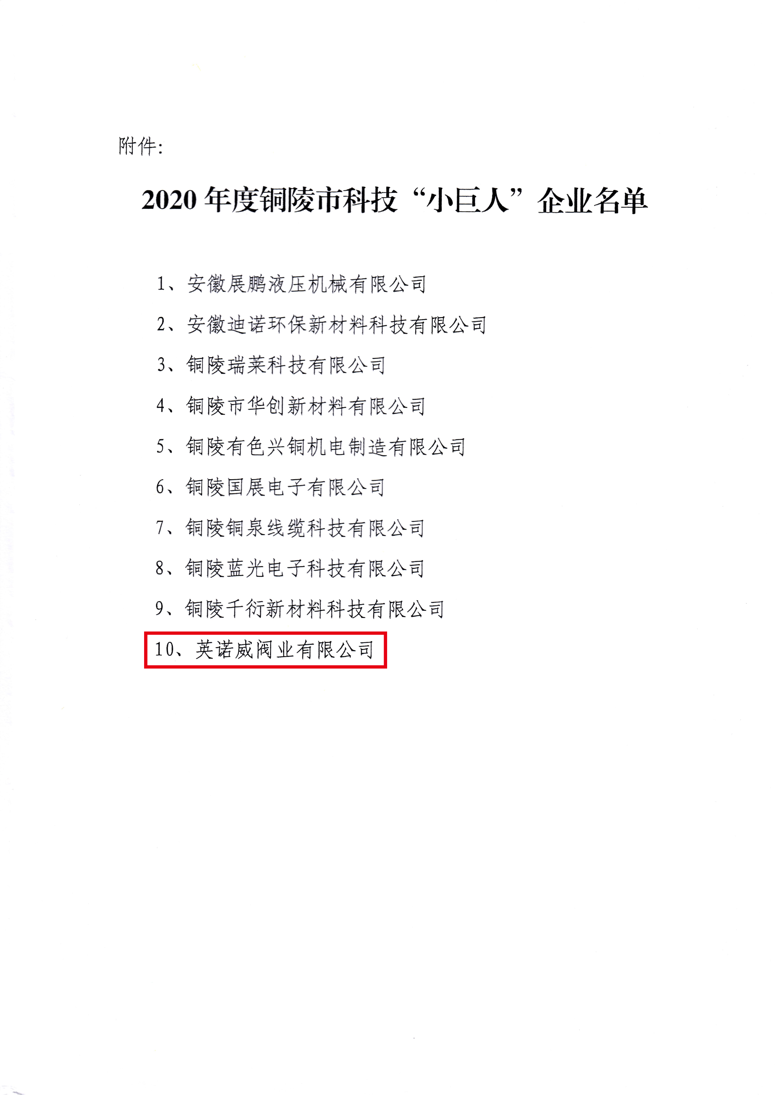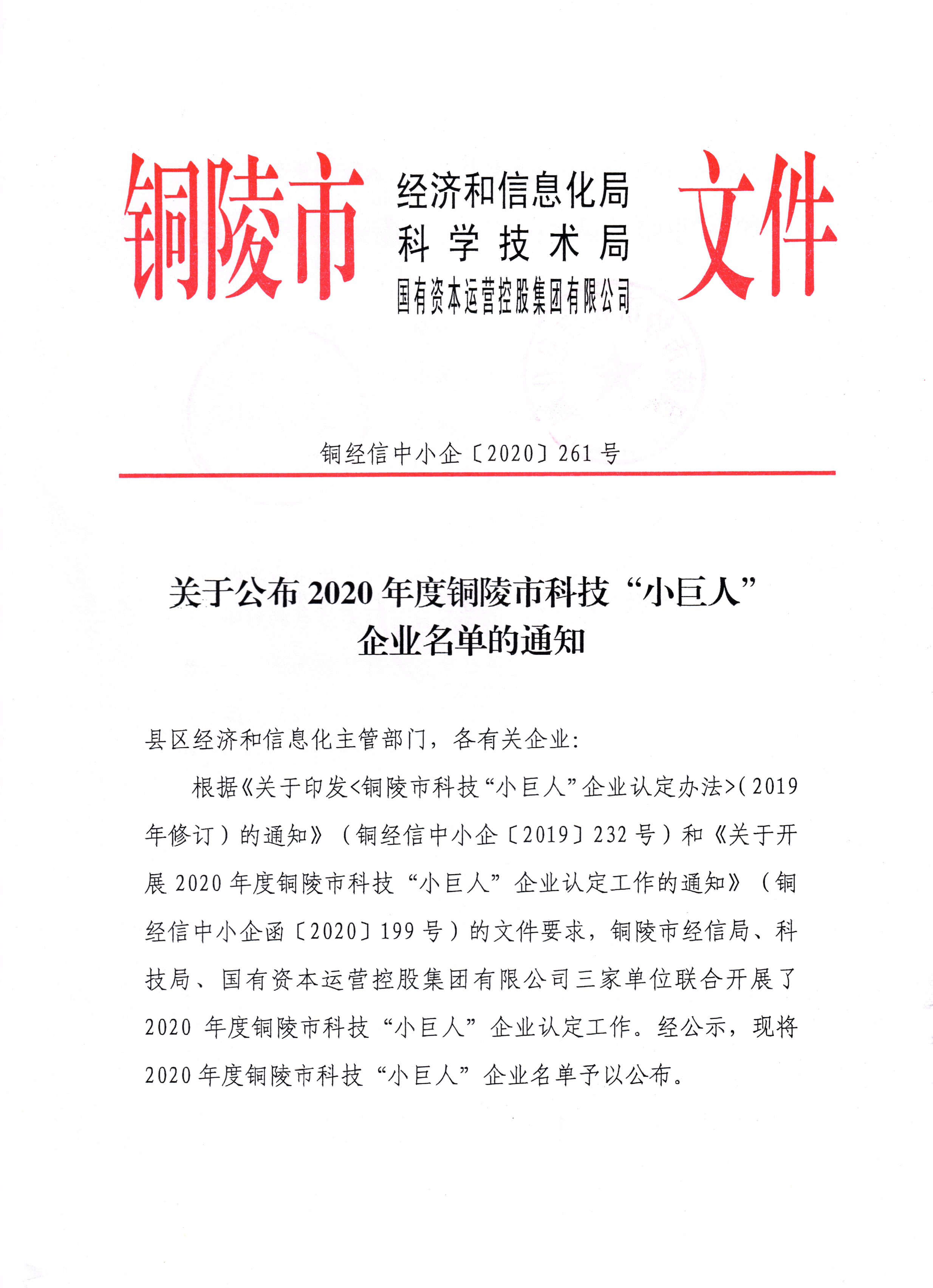 由銅陵市經(jīng)信局、科技局、發(fā)展投資集團公司三家單位聯(lián)合開展的2020年度銅陵市“科技小巨人”企業(yè)認定工作,銅都流體子公司英諾威閥業(yè)有限公司榜上有名。