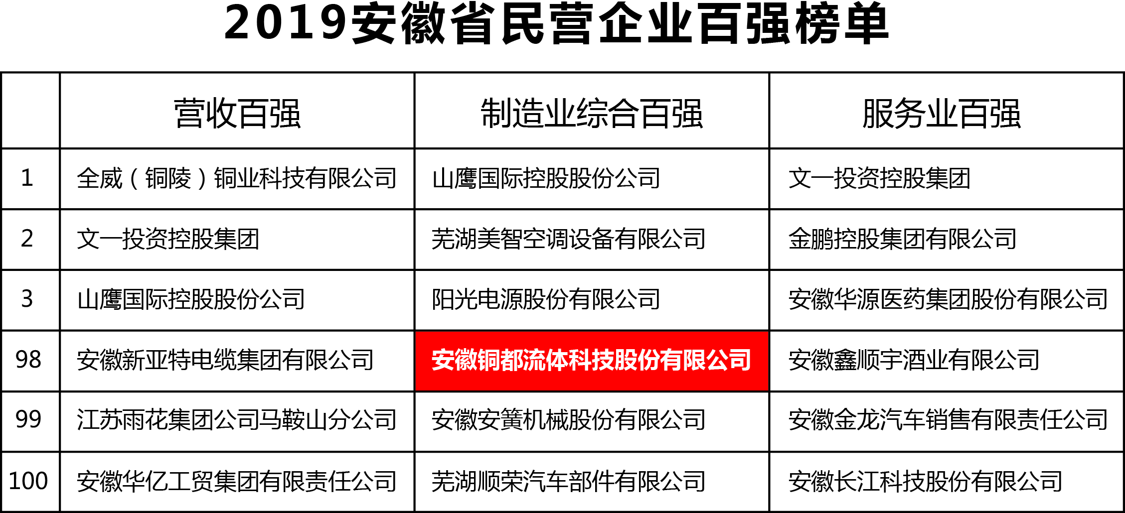 2019安徽省民營(yíng)企業(yè)百?gòu)?qiáng)榜單發(fā)布 銅都流體入圍制造業(yè)綜合百…