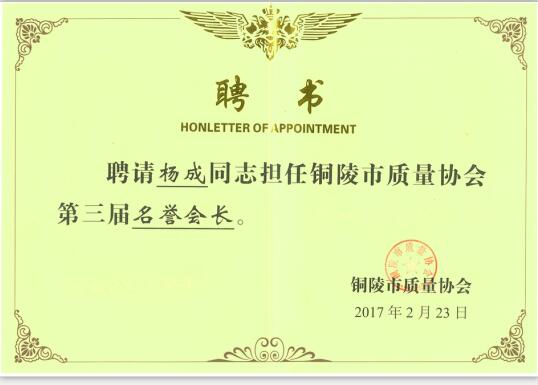 2017年2月末市質(zhì)量協(xié)會聘請董事長楊成先生,擔任銅陵市質(zhì)量協(xié)會第三屆名譽會
