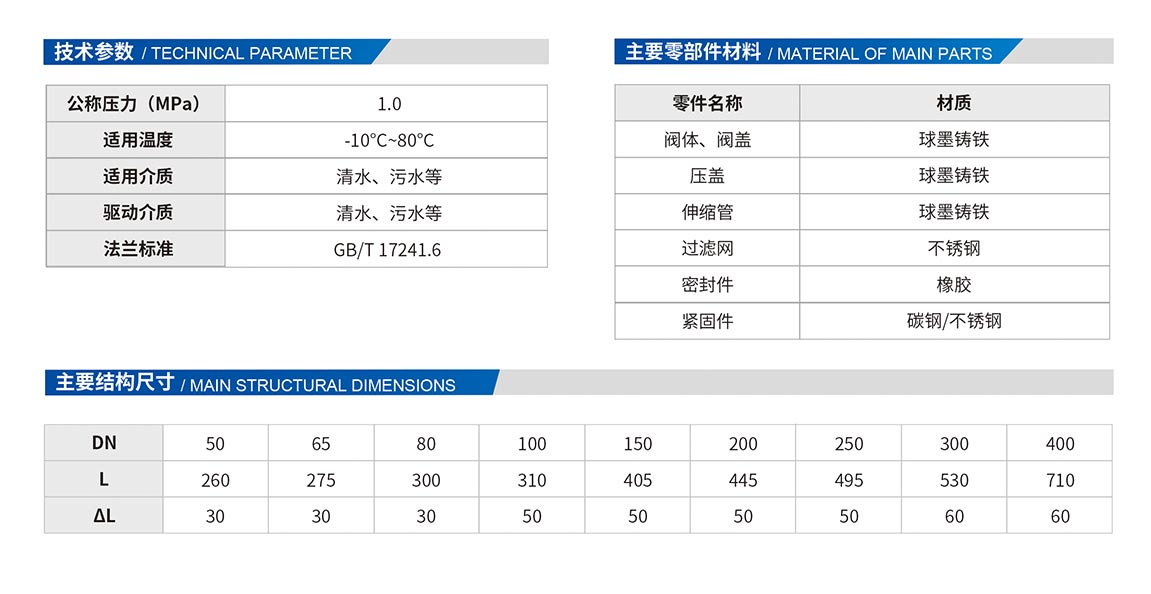 伸縮過濾器是過濾器和伸縮接頭的組合,它也是輸送介質(zhì)管道上不可缺少的一種裝置,通常安裝在減壓閥、泄壓閥、定水位閥或其它設(shè)備的進口端。當(dāng)管道中的介質(zhì)進入過濾器時,介質(zhì)通過濾網(wǎng)進入被連接的閥門中,而雜質(zhì)則留于過濾桶內(nèi),使各類閥門不會由于機械雜物卡入密封圈而失靈。另加不銹鋼伸縮拉桿,補償管道尺寸,安裝靈活。
